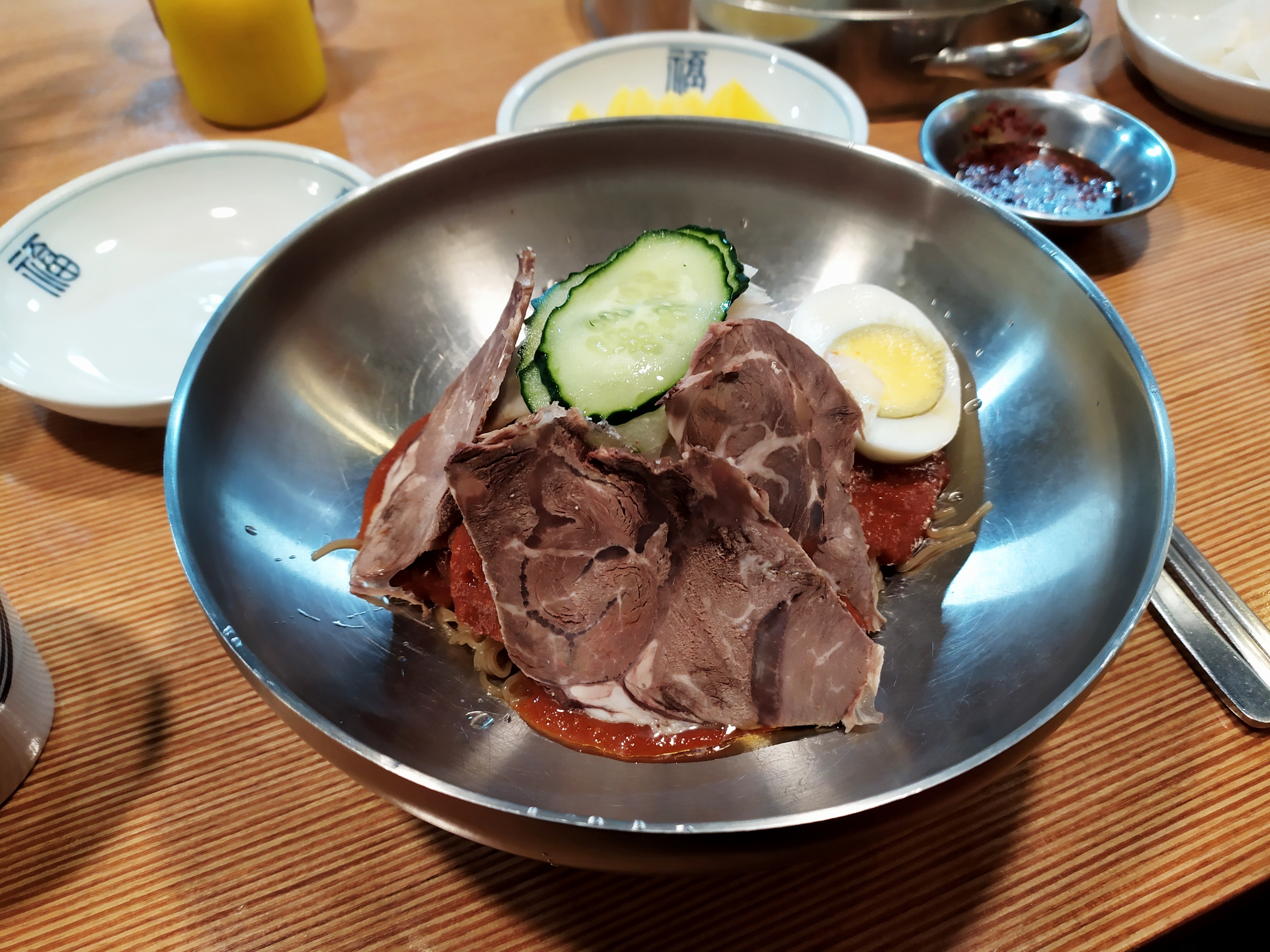 전체적인 구성은 이렇게 나온다. 반찬이 다양하지는 않으며, 필요하다면 셀프로 반찬을 더 가지고 올 수 있다. 하지만 처음부터 알맞게 반찬을 주는 편이라 더 들고 오지는 않았다. 비빔냉면의 경우, 온육수를 따로 준다.