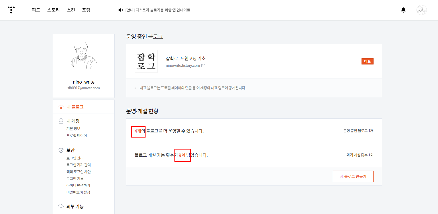 4개의 블로그를 더 운영하실 수 있고, 추가 개설 가능 횟수가 9회 남았다고 적혀 있을 겁니다.