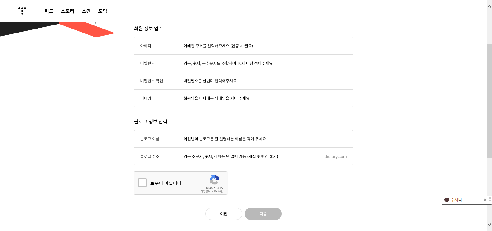 첫번째로는 티스토리 블로그 계정을 만드는 과정과 회원가입들을 설명하겠습니다.